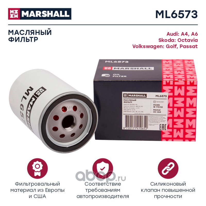 Расширенное описание: Фильтр масляный Audi A4 (B5) 94-; Skoda Octavia I (A4), II (A5) 96-; VW Passat (B3-B6) 88- (ML6573)