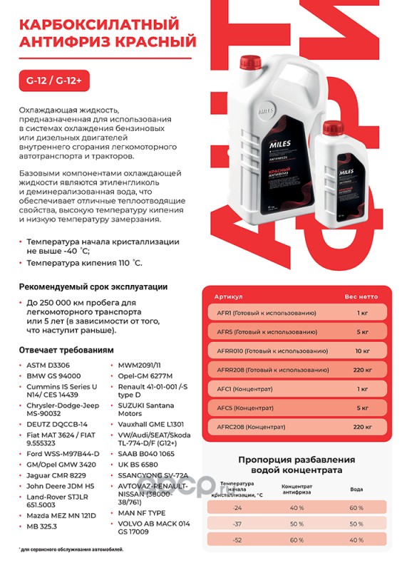 All World Cars - продажа товаров бренда Miles по всей России и странах СНГ. Развитая сеть представительств с быстрой доставкой товаров Miles и с гарантией выгодной цены. Покупая в AWC Антифриз G12/G12+ MILES готовый 4,4л вы бережете свое время, нервы и деньги. Каталожный номер производителя AFR5