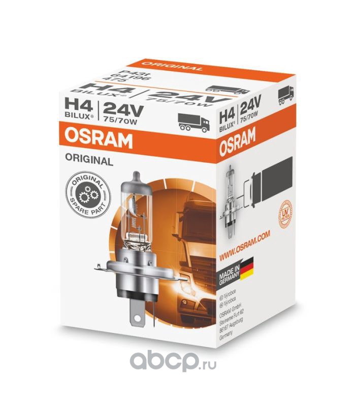 All World Cars - продажа товаров бренда Osram по всей России и странах СНГ. Развитая сеть представительств с быстрой доставкой товаров Osram и с гарантией выгодной цены. Покупая в AWC Лампа H4 24V- 75/70W (P43t) ORIGINAL LINE вы бережете свое время, нервы и деньги. Каталожный номер производителя 64196