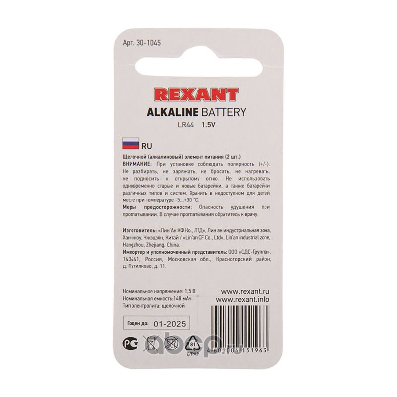 Батарейка LR44, AG13 REXANT