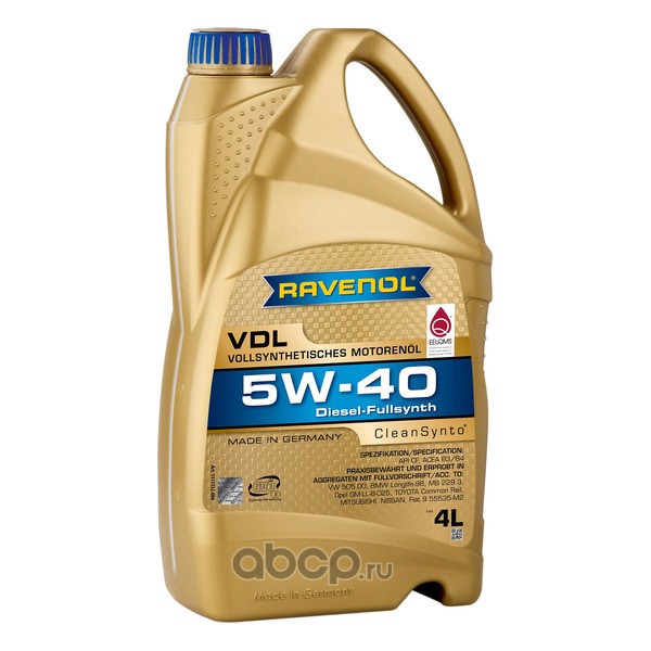 RAVENOL Vollsynthetic Dieseloel VDL 5W-40 – моторное масло высшего качества, изготовленное в Германии путем направленного органического синтеза и является синтетическим моторным маслом на основе полиальфаолефинов. Высокая термостабильность синтетической основы препятствует окислению масла и благодаря лонглайф свойствам, увеличивает межсервисные интервалы замены. Надёжно защищает двигатель при экстремально тяжёлых условиях эксплуатации, включая эксплуатацию автотранспорта в городском цикле «Старт-Стоп». Вязкостный интервал 5W40 позволяет применять полностью синтетическое моторное масло RAVENOL Vollsynthetic Dieseloel VDL 5W-40 круглогодично, включая холодную зиму. Специальный пакет присадок создаёт оптимальную защиту при высоких температурах и давлении, характерных для дизельных двигателей легковых автомобилей, микроавтобусов и джипов. Повышенное щелочное число гарантирует долговременную нейтрализацию кислот, образующихся при сгорании дизельного топлива.