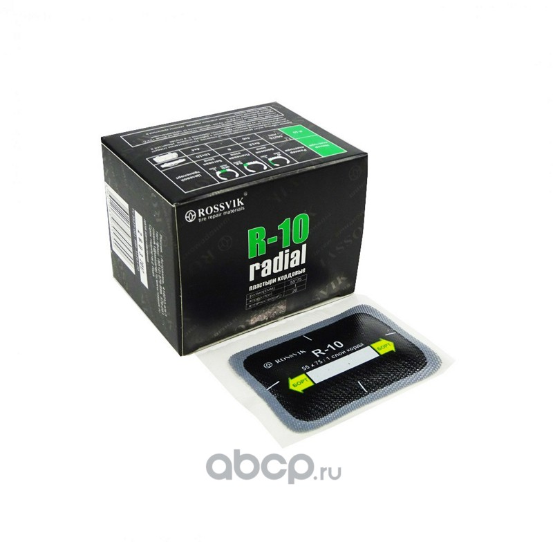 Расширенное описание: Пластыри R-10 (холодные) 55х75/1 сл., 20 шт. Размер 55х75 мм 20 шт. 1 слой корда Радиальные пластыри ROSSVIK предназначены для ремонта всех типов радиальных бескамерных и камерных шин легковых автомобилей, грузового и пассажирского транспорта, сельскохозяйственной, карьерной и землеройной техники. Они обеспечивают надежный и долговечный ремонт в любой ремонтопригодной зоне шины.