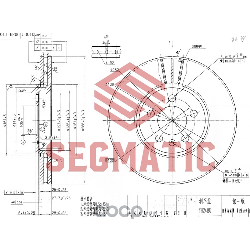 Диск тормозной пер AUDI A1 10-, A3 96-03, VW Polo Sedan (RUS) 10-, SKODA Fabia, Rapid, SEAT Cordoba 02-, Ibiza 02-,Leon 99-05,Toledo 99-04- [288*25*5]
