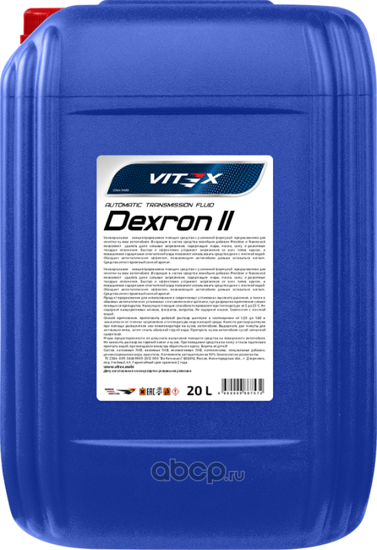 Универсальное всесезонное минеральное масло Vitex Dexron II Предназначено для использования в автоматических коробках передач, преобразователях вращения, гидроусилителях руля и гидравлических сцеплениях автомобилей, где предписан смазочный материал Dexron II. Применение масла Vitex гарантирует высокую эффективность работы агрегатов и узлов трансмиссии и гидравлики во всем рабочем диапазоне. Обеспечивает мягкое переключение передач и надежную защиту трущихся поверхностей от износа. Нейтрально к стандартным уплотнительным материалам. Specifications: General Motors Dexron II D Conforms to requirements: MB 236.6/236.7, MAN 339 Typ Z1/V1, ALLISON C4, CATERPILLAR TO-2, ZF TE-ML 09/11A/14A