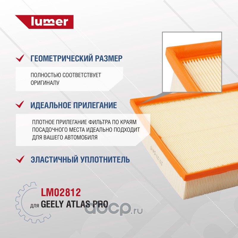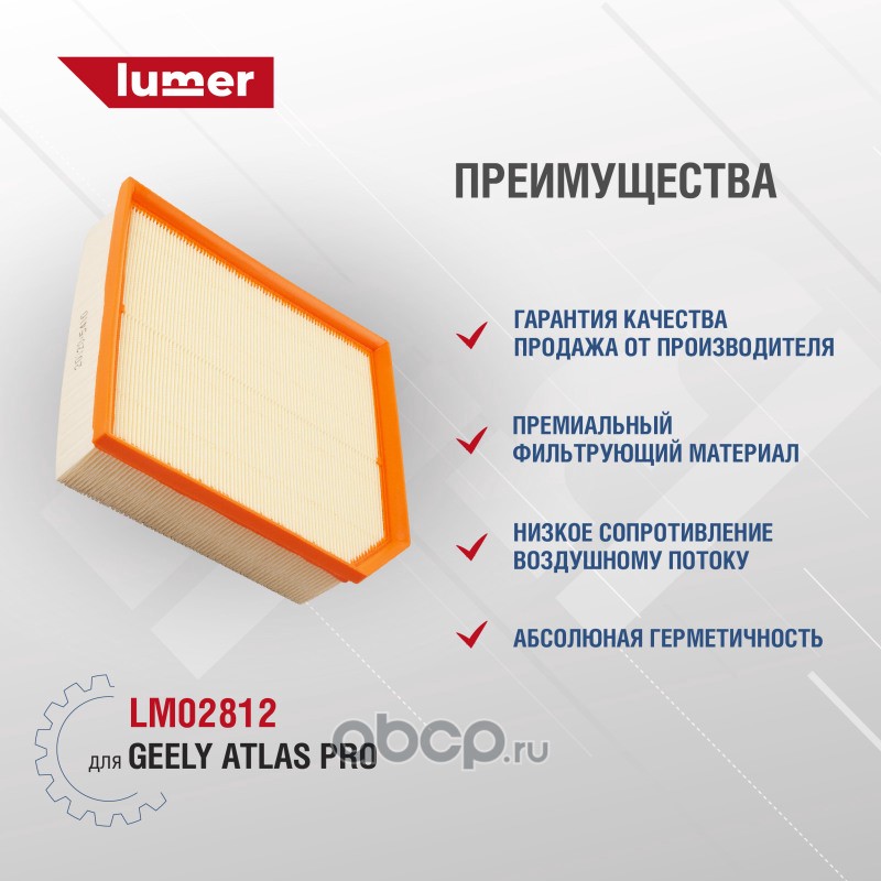 Фильтр воздушный Geely Atlas Pro. Благодаря высокому качеству фильтрующих материалов фильтр воздушный ДВС LUMER LM02812 позволяет уменьшить изнашивание деталей двигателя в несколько раз, увеличивая ресурс его работы. Уменьшает шум и повышает равномерность воздушного потока. За счет специальных пропиток фильтровальной бумаги увеличивается срок службы воздушного фильтра, а также сохраняется минимальное сопротивление воздушному потоку на протяжении всего межсервисного пробега, снижается шум и повышается равномерность воздушного потока, уменьшается количество попадаемой грязи в двигатель. Одно из основных преимуществ это высокая пылеемкость. Фильтр воздушный ДВС LUMER произведён на высокоточном оборудовании с полностью автоматизированной сборкой, 100% контроль качества каждой операции, полное соответствие оригиналам по посадочным местам и размерам и беспроблемной установке на автомобиль. Также встречающиеся названия для детали: фильтрующий элемент воздушного фильтра, элемент воздушного фильтра сменный, воздушный фильтр ДВС.